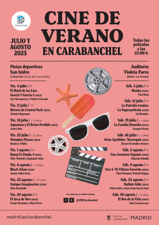 ...A partire da venerdì 4 luglio e per tutti i fine settimana estivi alle 22:00, i residenti potranno assistere a proiezioni gratuite all'aperto in due location: il centro sportivo del Parco San Isidro-Vicente Quesada e l'Auditorium Violeta Parra.